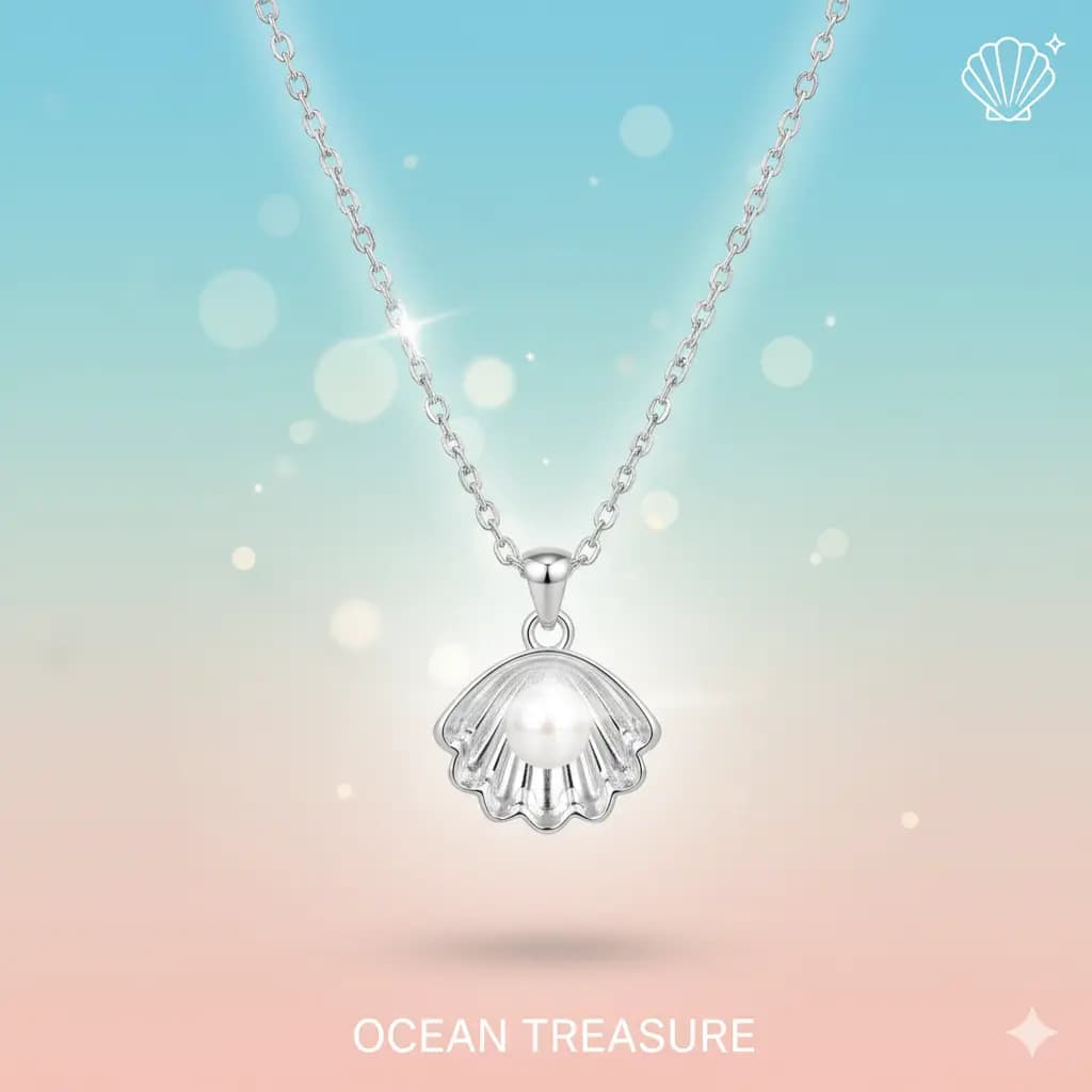 A coastal-chic necklace featuring a shell-shaped pearl pendant. This breezy, ocean-inspired piece pairs beautifully with summer outfits and adds a natural, organic elegance.