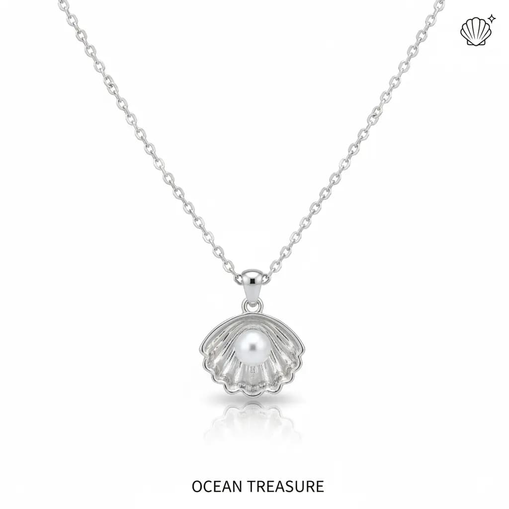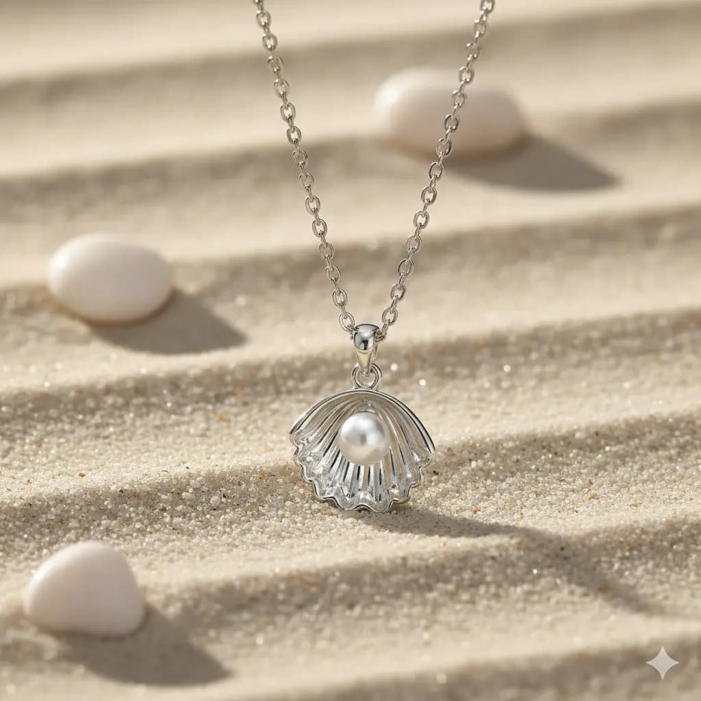 A coastal-chic necklace featuring a shell-shaped pearl pendant. This breezy, ocean-inspired piece pairs beautifully with summer outfits and adds a natural, organic elegance.